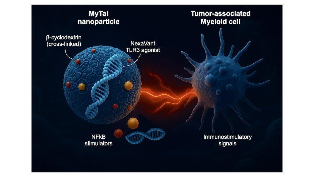 In a study published in ACS Nano (2025), the team introduced a carbohydrate-based nanoparticle system that combines a refined viral RNA agonist (NexaVant, NVT) with two small-molecule immune stimulators: R848 (a TLR7/8 agonist) and LCL161 (a non-canonical NF-κB activator). Unlike lipid nanoparticles, MyTai’s cyclodextrin-based carrier avoids cationic lipids, dramatically reducing systemic toxicity while maintaining efficient delivery to tumor-associated macrophages and dendritic cells.